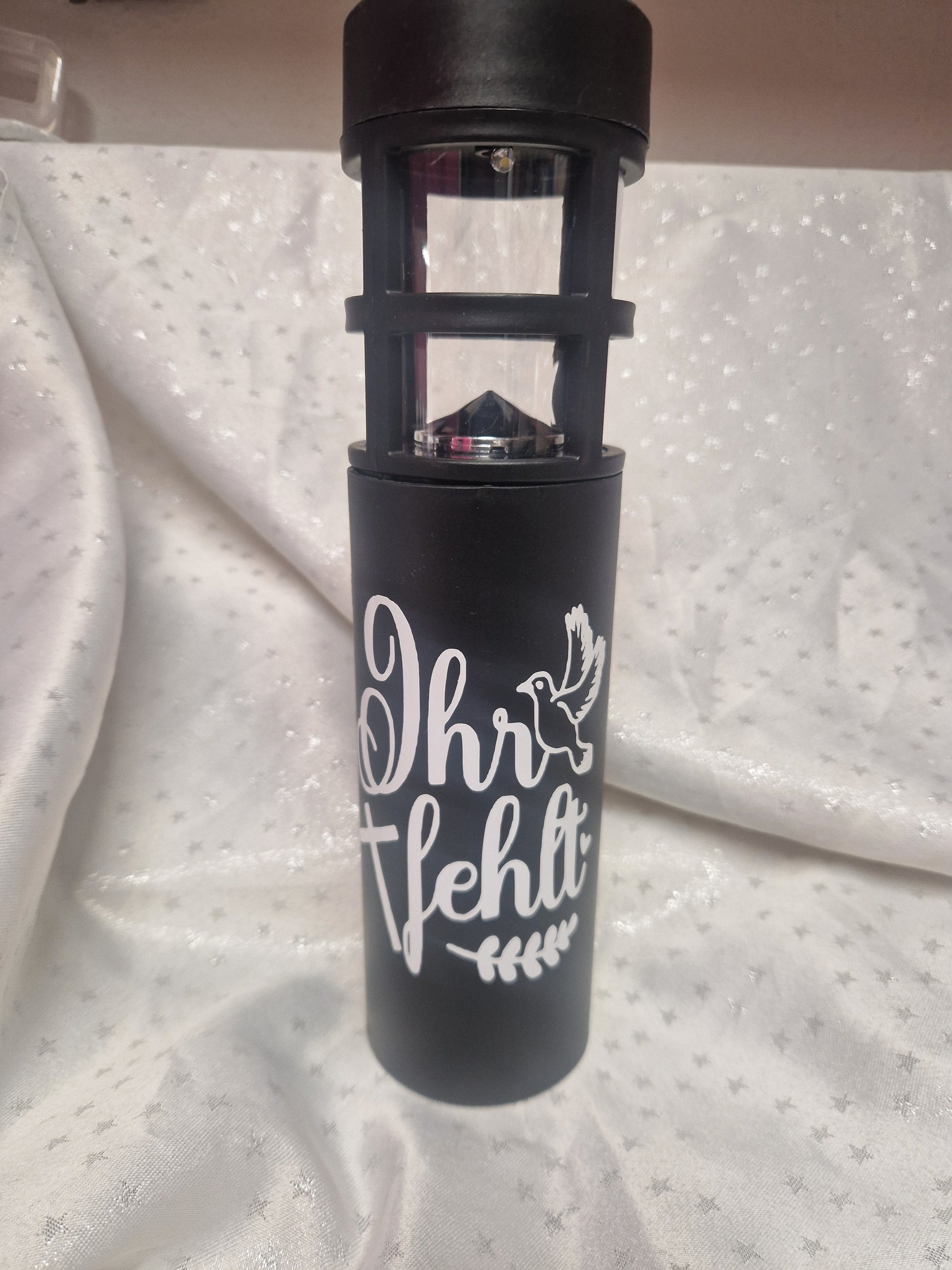 Lieferumfang . Solarlampe + Erdspieß (H 28cm x 7cm Durchmesser) zum besseren halt kann die Lampe einfach geöffnet werden um (Sand Steine)einzufüllen daher auch bestens für Grabplatten geeignet.